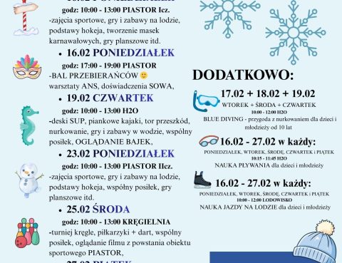 FERIE W MIEŚCIE 2026 – zapraszamy dzieci i młodzież! Zbliżają się ferie zimowe, a my mamy dla Was mnóstwo atrakcji, ruchu i dobrej zabawy! W czasie ferii zapraszamy dzieci i młodzież do wspólnego spędzania czasu na obiektach PIASTOR, H2O oraz w kręgielni. W programie m.in.: zajęcia sportowe, gry i zabawy na lodzie, podstawy hokeja i…
